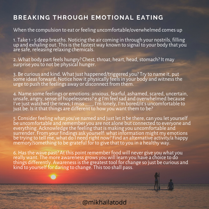 Emotions aren’t bad, they constantly fluctuate and provide useful information. Compulsions to eat are signs/messengers that something is requiring attention. Humans don’t like to feel pain, we are biologically instructed to do almost anything to avoid it. I believe collectively right now emotional eating is about fear, disconnection from ourselves and avoiding the way things are because they are not how we want them to be. This makes perfect sense if you, without realising, have recently been finding yourself eating when not physically hungry to numb, self-comfort or a means to gain control.